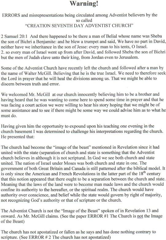 Whether through blind adherence to the current opinions of the mainstream SDA Church, prejudice against those with whom they are not already familiar, a love of sin, or simple ignorance of our true teachings (this factor will soon become apparent), there were some who attempted to publish a “warning” against the teachings of the CSDA Church for distribution.  Some of our beloved brethren in Canada, however, received a copy, and forwarded it to us for our edification.