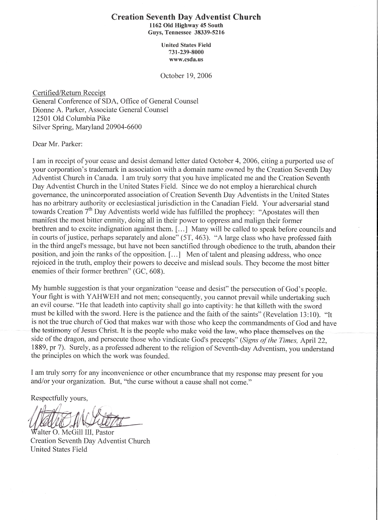 Update 07/22/05: Pastor Walter "Chick" McGill has drafted a letter to the lawfirm being used by the General Conference to enforce the Trademark asking for their understanding in the delay of his receiving the letter, as he is away currently on an evangelistic mission. The Letter may be read here.