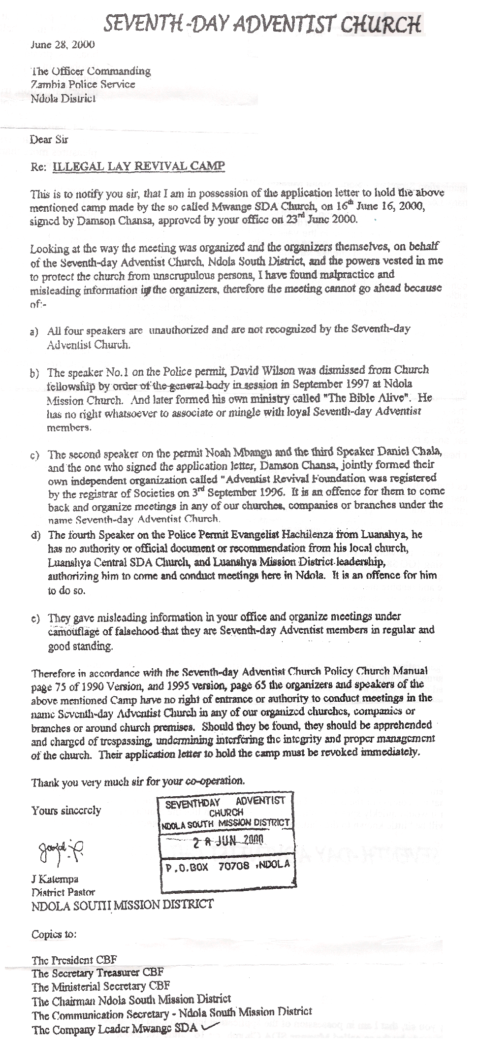 Letter from Pastor "Chick" to General Conference SDA Communications Department